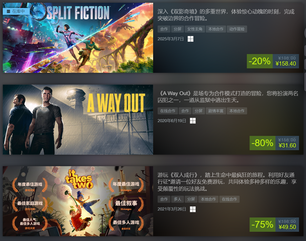 名副其实的合作冒险——该分屏冒险专为两人量身打造。体验合作游戏玩法,在此,玩家们必须协调行动和时机,共同努力克服挑战。使用好友通行证,邀请一名好友在任意平台(PS、Xbox 和 PC 跨平台游戏)上免费游玩。大促期间,另外两款来自 Hazelight 工作室的优秀合作游戏也将参与促销!
